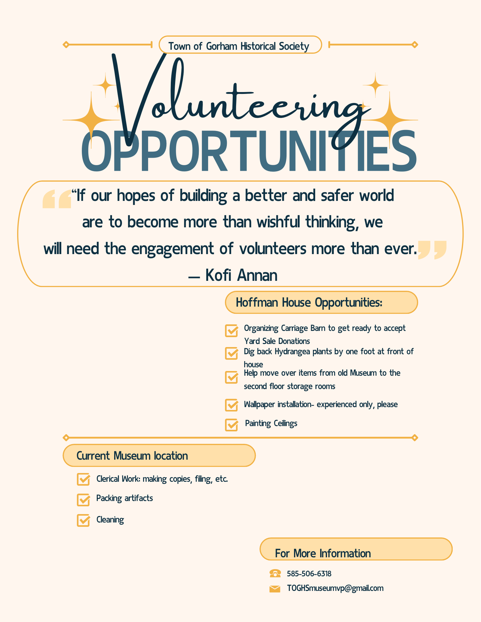 Volunteering with the Town of Gorham Historical Society offers a unique and rewarding experience. Your efforts directly contribute to preserving our rich local history and helping us achieve our dream of transforming the Hoffman House into our permanent museum. Be a part of something meaningful that will benefit Gorham for years to come.